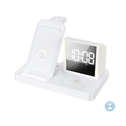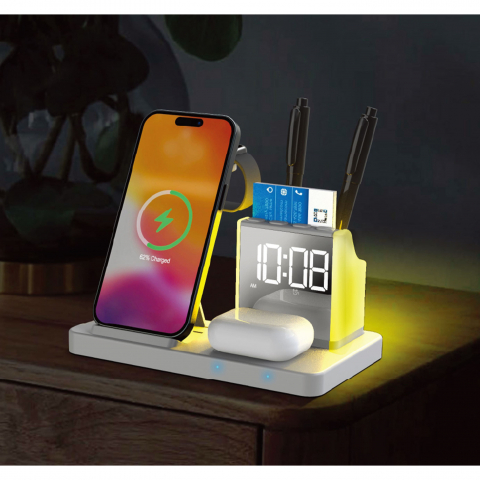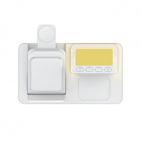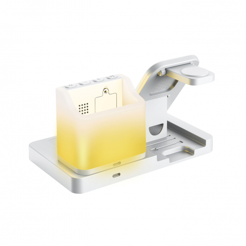 Time Dock — это интеллектуальный центр для вашего рабочего стола или прикроватной тумбы. Устройство сочетает в себе мощную беспроводную зарядку для всей экосистемы Apple, цифровой будильник с гибкой настройкой яркости и практичный органайзер для канцелярии. Брендирование: тампопечать, УФ-печать или шелкопечать. Размер изделия: 178 х 113 х 122 мм.