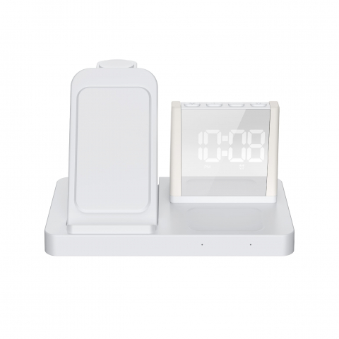 Зарядка 3-в-1: Специальные зоны для одновременного питания смартфона (на подставке), наушников TWS (на платформе) и Apple Watch (на отдельном креплении).