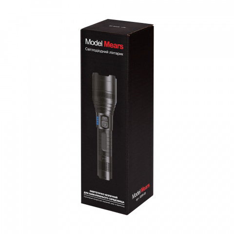 Світлодіодний ліхтарик Mears енергетично безпечний для навколишнього середовища. Водостійкий і ударостійкий алюмінієвий корпус. Простий у використанні, легкий і компактний. В комплекті ремінець на руку. Надяскравий світлодіод XHP50. Режими: 5 ( 100%, 75%, 50%, стробоскоп, SOS). Акумулятор: 1 х 18650 2000 mAh. Індикатор живлення акумуляторної батареї. ПОПЕРЕДЖЕННЯ: Не направляйте промінь в очі, оскільки це може зашкодити зору. Бережіть прилад подалі від дітей. У разі тривалого простою, акумулятор слід вийняти і зберігати в сухому і прохолодному місці. Упаковка індивідуальна. Метод нанесення: Гравіювання.